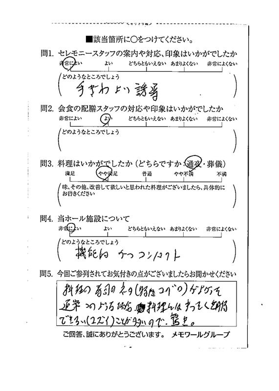 急な変更に対しても心良く対応して頂きました。小島友和さん、及川良子さんには大変お世話になりました。お見積りの際、写真と金額の説明がとても分かりやすかった。メモワールホール瀬谷は、とても綺麗で特に待合室が広くホテル並みでびっくりしました。会員になると色々な特典があり、やはり価格的な面では良いという事、親切、分かりやすい対応をしてもらえる事を伝えたいです。