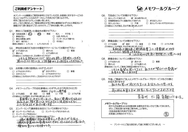とても丁寧で親切でした。エンバーミングを行い、故人がきれいになって皆喜んでいました。思い出に残る葬儀が出来ました(歌も入れる事ができました)とても親切なので、加入しておくといざと言う時に良いです。