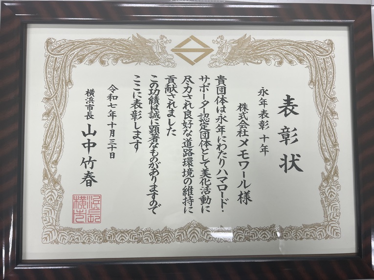 横浜市ハマロード・サポーター10年永年表彰を受賞しました!
